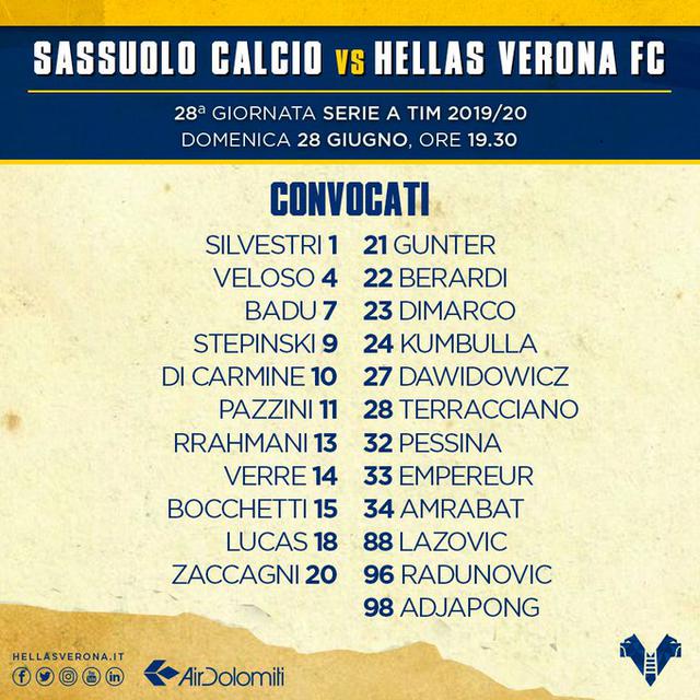 1 Silvestri 4 Veloso 7 Badu 9 Stepinski 10 Di Carmine 11 Pazzini 13 Rrahmani 14 Verre 15 Bocchetti 18 Lucas 20 Zaccagni 21 Gunter 22 Berardi 23 Dimarco 24 Kumbulla 27 Dawidowicz 28 Terracciano 32 Pessina 33 Empereur 34 Amrabat 88 Lazovic 96 Radunovic 98 Adjapong.
