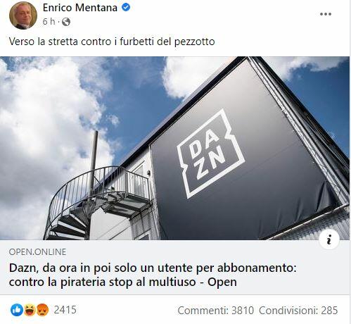 Bufera social intorno a Enrico Mentana. Il noto giornalista di La7, in mattinata, ha pubblicato un post su Facebook riguardante l’ultima novità di Dazn. Come è noto, infatti, la piattaforma streaming del gruppo Perform ha deciso di rendere più stringenti le proprie condizioni di utilizzo, adottando la politica per cui non sarà più possibile condividere un account. Mentana ha così esultato su Fb: “Verso la stretta contro i furbetti del pezzotto”.