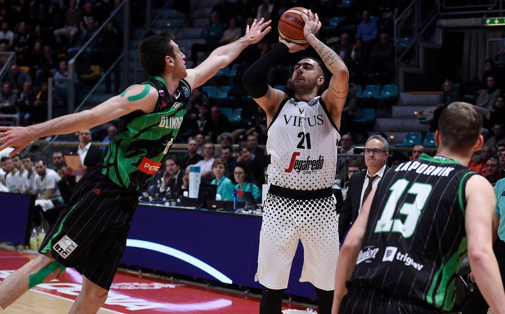Sotto per quasi tutta la gara, la Virtus riesce a battere Lubiana 87-84 grazie ai punti decisivi di Aradori. Primo posto in Champions League quasi blindatoLa Virtus non è bella, non è divertente ma almeno ha ricominciato a vincere. Anche contro Lubiana infatti i bianconeri hanno sofferto le pene dell’inferno rincorrendo l’avversario per quasi tutta la gara pagando un avvio terribile, la scarsa vena degli americani ed una condizione precaria di Qvale ma alla fine conta solo il risultato. Anzi i risultati: contemporaneamente infatti Strasburgo ha perso e quindi il primo posto nel girone di Champions League è ipotesi sempre più concreta. Il primo quarto è terribile per la Virtus che viene massacrata sotto canestro dall’ex Begic finendo a -13 già poco dopo metà frazione riuscendo a limitare i danni soltanto grazie ad un quintetto di specialisti difensivi. Nuovo massimo vantaggio per Lubiana nel secondo quarto prima che arrivi una fiammata (l’unica) firmata da Taylor e Punter con un 12-0 di parziale che riapre l’incontro e soprattutto tiene vive le Vu Nere ed il pubblico del PalaDozza. Dal 37-41 di metà gara si arriva al pareggio a quota 43 a cui seguono minuti convulsi in cui Martin e Kravic mettono in campo grande agonismo permettendo di toccare anche il primo vantaggio della serata (55-54). Nel quarto finale però si decide tutto e sono MBaye e Baldi Rossi i primi a crederci seguiti nel momento decisivo da Aradori: il parziale dell’ex capitano è da leader vero con 14 punti e la bomba che chiude le ostilità nell’ultimo minuto. Lapornik prova a tenere in partita Lubiana fino alla fine ma la volata verso il traguardo premia giustamente la Virtus. VIRTUS SEGAFREDO BOLOGNA – OLIMPIA LUBIANA 87-84 (13-23, 37-41; 61-63) VIRTUS SEGAFREDO BOLOGNA: Punter 8; Martin 6; Pajola 0; Taylor 13; Baldi Rossi 11; Cappelletti NE; Kravic 14; Aradori 17; M’Baye 9; Cournooh 8; Camara NE; Qvale 1. All. Sacripanti OLIMPIA LUBIANA: Tratnik 4; Span 14; Lazic 2; Samanic 12; Simonovic 7; Lapornik 12; Begic 19; Badzim 6; Sanon 6; Rebec 2; Radulovic 0; Kastrati 0. All. Nikitovic
