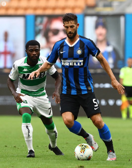 L’Inter spreca una grossa opportunità per rimanere in scia della Juventus. Soltanto un pareggio contro il Sassuolo. Altalena di emozioni nel 3-3 TABELLINO INTER-SASSUOLO 3-3 4′ Caputo (S), 41′ rig. Lukaku (I), 45’+1 Biraghi (I), 81′ rig. Berardi (S), 86′ Borja Valero (I), 89′ Magnani (S) FORMAZIONI: INTER (3-4-1-2): Handanovic; Skriniar, Ranocchia (54′ De Vrij), Bastoni; Moses (75′ Candreva), Gagliardini, Borja Valero, Biraghi (75′ Young); Eriksen (62′ Agoumé); Lukaku, Sanchez (62′ Lautaro). All. Conte SASSUOLO (4-2-3-1): Consigli; Muldur, Chiriches (79′ Magnani), Ferrari, Rogerio (46′ Kyriakopoulos); Obiang, Magnanelli (58′ Locatelli); Berardi, Djuricic, Boga (67′ Haraslin); Caputo (58′ Defrel). All. De Zerbi Ammoniti: Rogerio (S), Skriniar (I), Bastoni (I) LA CRONACA: dopo 4 minuti subito il gol di Caputo. Al 41′ il pari di Lukaku su rigore, e nel finale di tempo il 2-1 di Biraghi. Nella ripresa Gagliardini si divora il tris a porta vuota. All’81’ il pari di Berardi su rigore. Borja Valero riporta avanti i nerazzurri a quattro minuti dalla fine, ma Magnani pareggia all’89’. Conte ammonito, era diffidato e salterà la prossima partita (contro il Parma).