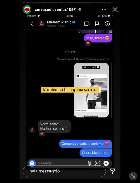 "Mire, torni?", "Vorrei tanto..ma non so se si fa". Firmato Miralem Pjanic. La trattativa per il ritorno del regista bosniaco alla Juventus, che lo scorso anno lo ha ceduto al Barcellona nello scambio con Arthur, non ha ancora trovato sbocchi ma il calciatore ha espresso la sua volontà di tornare. E lo ha fatto in chat, su Instagram, con l'account curvasudjuventus1897 che ha poi pubblicato lo screen della conversazione. Un gesto inequivocabile per Pjanic che, alla Juventus, ritroverebbe tanti ex compagni ma soprattutto il tecnico Massimiliano Allegri. La palla adesso passerá ai bianconeri e al Barcellona che dovranno cercare di chiudere la trattativa entro e non oltre le 20 di oggi. Per Pjanic alla Juve é corsa contro il tempo: il calciatore ha però le idee chiare.