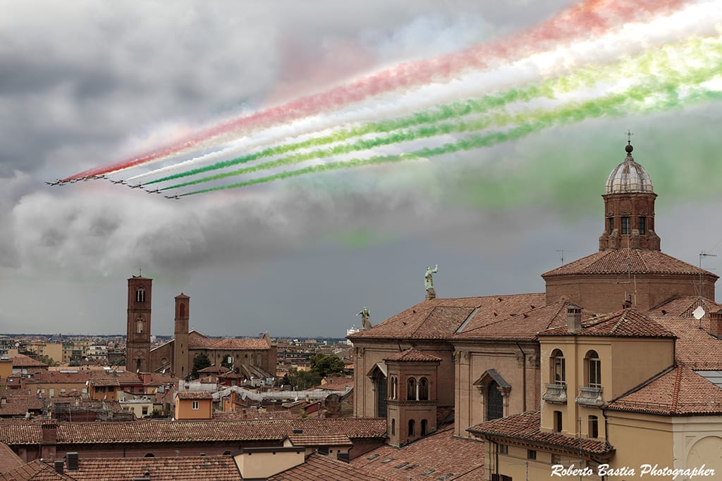 Le frecce a fine luglio saranno in Romagna. Il loro passaggio sopra i cieli di Bologna e il sogno della sfida inaugurata da Tazio Nuvolari negli anni ’30 Quando tre colori segnano con una vena di patriottismo un ulteriore elemento della progressiva uscita dall’incubo. Peccato per l’anticipo di orario che il 29 maggio ha fatto sì che la concentrazione della gente di Bologna fosse lontana (mentalmente) da questo spettacolo 75′ prima del momento pianificato e pattuito, ma dopo le 15 era previsto scroscio, il che avrebbe limitato le evoluzioni e reso poco visibili le scie multicolori. Notizia: a fine luglio saranno in Romagna. Le frecce tricolori nascono nell’aeroporto di Rivolto, in Friuli, e hanno come primogenitori un sacco di pattuglie acrobatiche che negli anni ’50 fungono da incubatrice di questo gruppo. Ma ancora prima c’era la voglia di acrobazie in volo, e gli aeroporti di Campoformido, Linate, Padova e Caselle ospitarono 6 lustri di tentativi spettacolari ma un po’ disorganici, dagli anni ’30 in avanti. La Pattuglia Acrobatica Nazionale fu costituita nel ’61 e i Diavoli Rossi presero la leadership della “fusione” tra i vari gruppi versati nelle acrobazie aeronautiche. Da Squarcina, il primo leader, all’attuale Farina sono 23 i comandanti che si sono alternativi in quasi 60 anni di vita (ed è già immaginabile quali celebrazione potranno avvenire nel 2021). Volano in undici come una squadra di calcio anche se hanno cominciato in otto. Ventotto sono i componenti periti in incidenti di volo.La cosa bella è che il loro arrivo in qualunque parte del mondo scatena la fantasia di fotografi e cineoperatori. Noi abbiamo raccolto gli scatti di Roberto Bastia (che ha fotografato da un posto spettacolare che si chiama “Lo sguardo del Podestà”) e Mirco Zanetti che era a San Michele in Bosco, un balcone naturale sul centro città. Ah, io ho un piccolo sogno. A Istrana, aeroportino militare nei pressi di Treviso, nel novembre 1981 fu organizzata una sfida tra la Ferrari di Gilles Villeneuve, l’Alfa Romeo di Patrese e la Brabham di Giacomelli e i caccia F 104 Starfighter pilotati dal Maggiore De Vincenti e dal suo gruppo. Vinse Gilles e fu iul trionfo personale di Marcello Sabbatini, fondatore del giornalismo motoristico italiano, di Autosprint e Motosprint, e allora direttore dello “scissionista” Rombo. Gilles era il suo modello e il suo idolo. E io ebbi il privilegio di lavorare per anni in tv con Marcello. Bene, mi piacerebbe…no, non che delle F1 di oggi sfidassero le Frecce. Non sarebbe possibile per nessuno dei due. Ma che in qualche modo quella sfida, per la prima volta affrontata da Tazio Nuvolari 50 anni prima, fosse riproposta anche solo con mezzi …datati. E piloti magari attempati ma bravi, il che è poi il sale della sfida. Mi sa che me lo sogno.