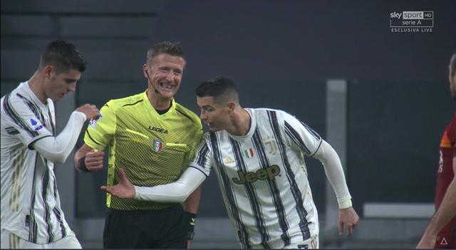 #Orsato ride divertito perchè #Ronaldo insiste per controllare che non gli sia squillato l’avviso del gol dopo un tiro che nemmeno ha sfiorato la linea di porta. #CR7 non potrebbe permetterselo, ma l’arbitro è felice come una pasqua. AJA e Juve, due cuori una capanna.#JuveRoma pic.twitter.com/F6AxmBNshM