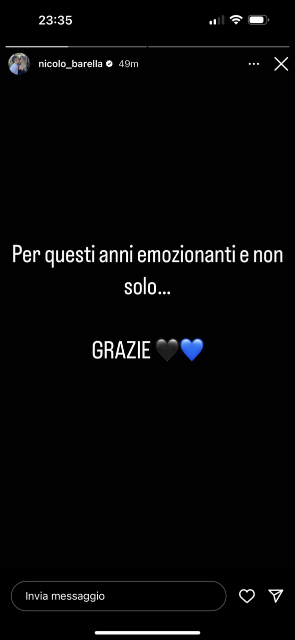 Nicolò Barella ha pubblicato una Storia Instagram dove ha ringraziato i calciatori che non faranno più parte dell’Inter dalla prossima stagione.
