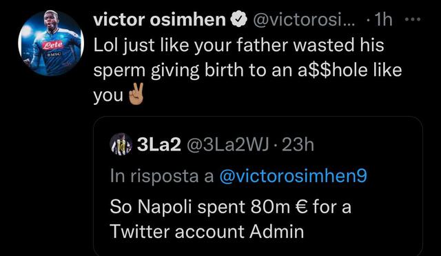 Victor Osimhen ancora protagonista di uno scontro social, questa volta contro ed un tifoso della Juventus che lo aveva accusato di spendere troppo tempo su Twitter. La risposta dell’attaccante del Napoli non si è fatta attendere ed è stata durissima: “Just like your father wasted his sperm giving birth to an asshole like you” che tradotto significa “come tuo padre ha sprecato il suo sperma mettendo al mondo uno str*** come te”.