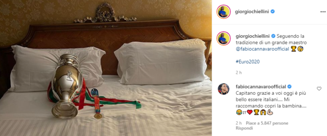 Chiellini dopo Cannavaro, un altro difensore della Juventus ha alzato la coppa con la maglia della Nazionale. Non è la Coppa del Mondo, ma ci accontentiamo: il capitano Giorgio Chiellini ha scattato una foto, pubblicata su Instagram, con il trofeo sistemato a letto, dopo essere arrivati in albergo a Roma. Esattamente come fece il suo illustre predecessore nel 2006, dopo aver vinto il Mondiale a Berlino: e infatti, Cannavaro ha risposto a Chiellini, ricordandogli di “coprire la bambina”. Ecco il simpatico scambio di battute e la foto: