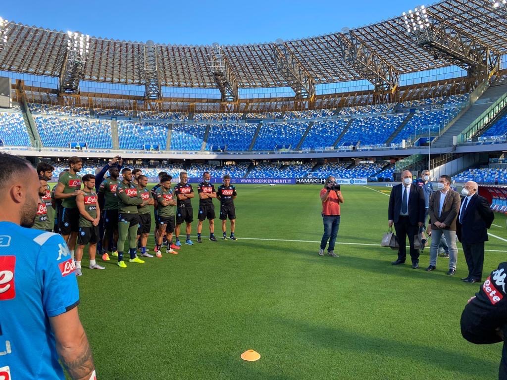 Stadio San Paolo, il governatore della Regione Campania Vincenzo De Luca ha fatto l’in bocca al lupo al Napoli in vista del match di domani contro l’Inter Il governatore della Regione Campania Vincenzo De Luca ha fatto visita all’SSC Napoli prima della rifinitura andata in scena quest’oggi al San Paolo in vista della semifinale di ritorno contro l’Inter. Il politico ha pubblicato le foto dell’incontro con il team allenato da Gennaro Gattuso in un post su facebook condito anche da un sentito in bocca al lupo. “Ho voluto salutare e fare gli auguri per la ripresa della stagione calcistica alla squadra del Napoli, al presidente De Laurentiis e a mister Gattuso. Un rapido in bocca al lupo oggi al San Paolo prima dell’allenamento di rifinitura prima della partita di domani in Coppa Italia contro l’Inter. Il colpo d’occhio dello Stadio San Paolo che la Regione Campania ha rimesso a nuovo per le Universiadi è sempre bellissimo e vuole essere oggi insieme ai giocatori, all’allenatore e la dirigenza tutti insieme, un segno di ripresa per il calcio e per lo sport, di ritorno alla vita normale per tutti“. https://www.facebook.com/53388213256/posts/10158150162798257/?d=n