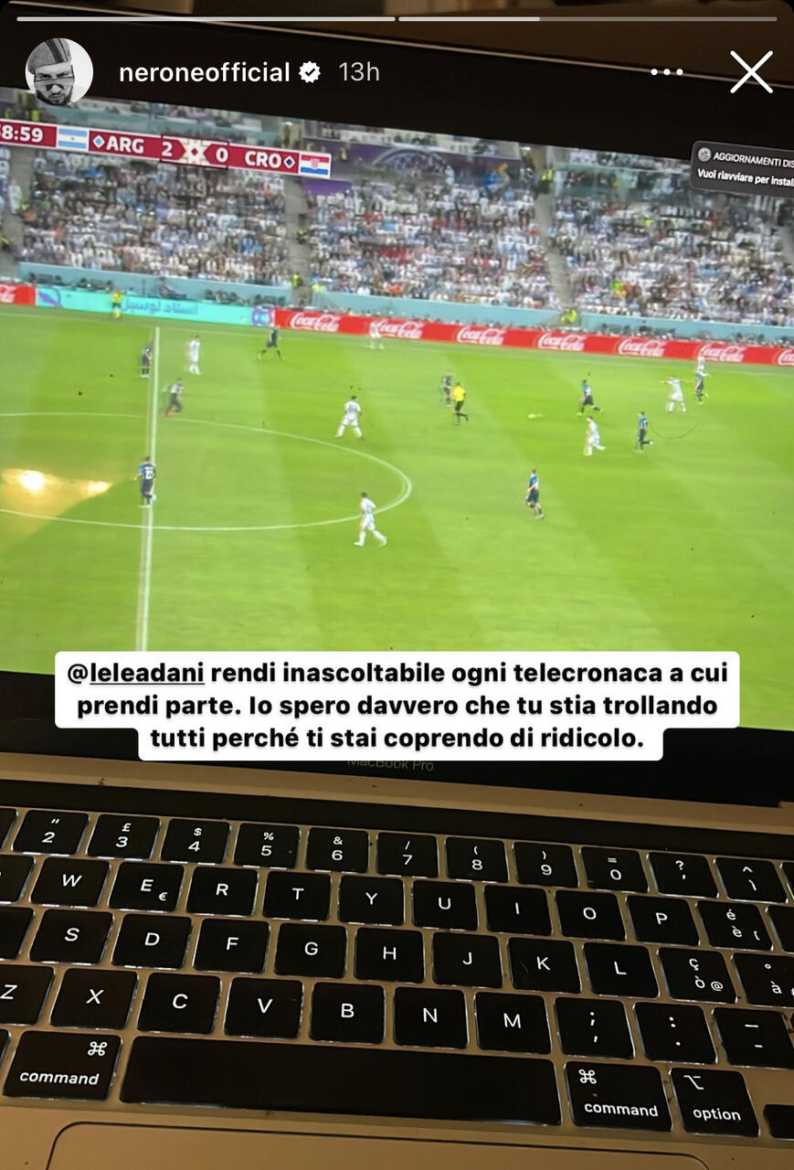 Queste le parole del noto rapper milanese Nerone in una storia su Instagram contro Lele Adani: “Rendi inascoltabile ogni telecronaca a cui prendi parte. Io spero solo che tu stia trollando perché ti stai coprendo di ridicolo”.