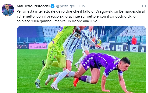 Maurizio Pistocchi, sul proprio profilo Twitter, ha commentato così il rigore non concesso alla Juventus al minuto 78' per un contatto Dragowski-Bernardeschi: "Per onestà intellettuale devo dire che il fallo di Dragowski su Bernardeschi al 78’ è netto: con il braccio sx lo spinge sul petto e con il ginocchio dx lo colpisce sulla gamba: manca un rigore alla Juve".