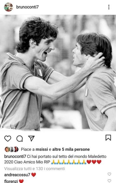 Tra coloro che hanno voluto ricordare l'indimenticato Paolo Rossi, eroe dei Mondiali di Spagna 1982 scomparso stanotte per un male incurabile, c'è anche l'ex compagno della nazionale Bruno Conti. La bandiera della Roma ha pubblicato un post su Instagram: "Ci hai portato sul tetto del mondo. Maledetto 2020. Ciao amico mio, RIP".