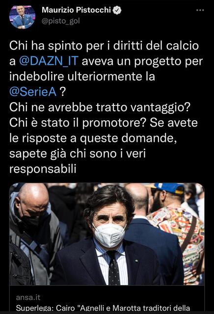 “Chi ha spinto per i diritti del calcio a @DAZN_IT aveva un progetto per indebolire ulteriormente la @SerieA? Chi ne avrebbe tratto vantaggio? Chi è stato il promotore? Se avete le risposte a queste domande, sapete già chi sono i veri responsabili”