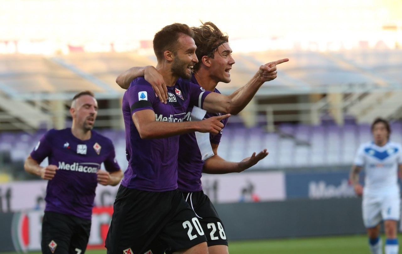 Live Serie A: già due gol nel primo tempo tra Fiorentina e Brescia. Ospiti in vantaggio grazie al rigore trasformato da Donnarumma al 17′. Proteste dei lombardi per la mancata espulsione di Caceres nell’occasione del penalty. I viola trovano dodici minuti dopo il pareggio grazie allo stacco di testa del capitano German Pezzella FIORENTINA-BRESCIA 1-1 LIVE (fine primo tempo) 17′ rig. Donnarumma (B), 29′ Pezzella (F) FIORENTINA (4-3-3): Dragowski; Caceres, Pezzella, Ceccherini, Dalbert; Castrovilli, Pulgar, Duncan; Chiesa, Vlahovic, Ribery. All. Iachini BRESCIA (4-3-2-1): Joronen; Sabelli, Papetti, Mateju, Semprini; Bjarnason, Tonali, Dessena; Zmrhal, Skrabb; Donnarumma. All. Lopez Ammoniti: Caceres (F), Ceccherini (F), Dalbert (F) https://twitter.com/acffiorentina/status/1275127278196965376?s=20 https://twitter.com/acffiorentina/status/1275128332179382273?s=20 https://twitter.com/acffiorentina/status/1275127720784125953?s=20