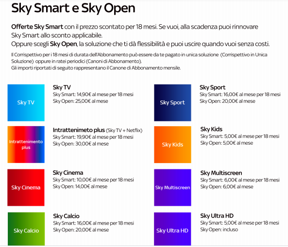 - Le offerte Sky Smart con il prezzo scontato per 18 mesi alla scadenza dei quali potrai rinnovare Sky Smart allo sconto applicabile al momento del rinnovo.