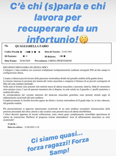Fabio Quagliarella non vuole più sentire falsità sul suo conto. L'attaccante della Sampdoria, fermo ai box a causa di un infortunio, ha pubblicato un'Instagram story con tanto di referto degli esami strumentali sostenuti per valutare le condizioni del polpaccio. Nel documento si legge l'esito: una piccola lesione della giunzione miotendinea distale del gemello mediale della gamba destra, lesione di secondo grado in fase subacuta. Il commento del giocatore è senza mezzi termini: "C'è chi (s)parla e chi lavora per recuperare da un infortunio! Ci siamo quasi…forza ragazzi! Forza Samp!".
